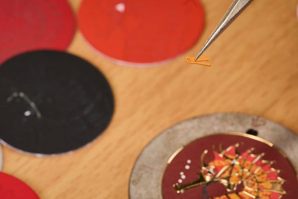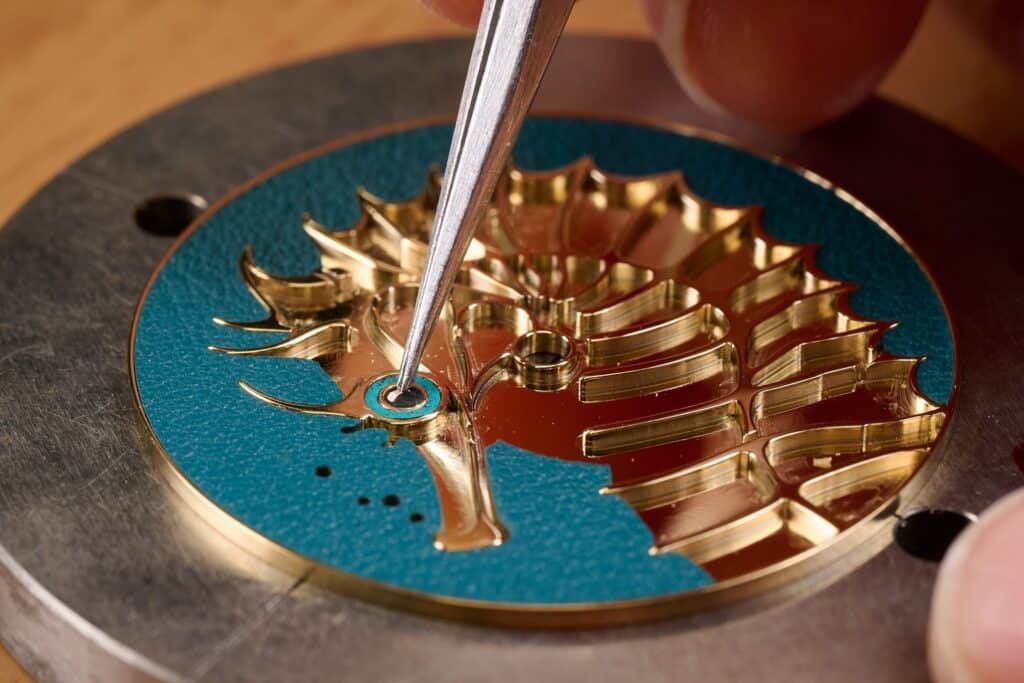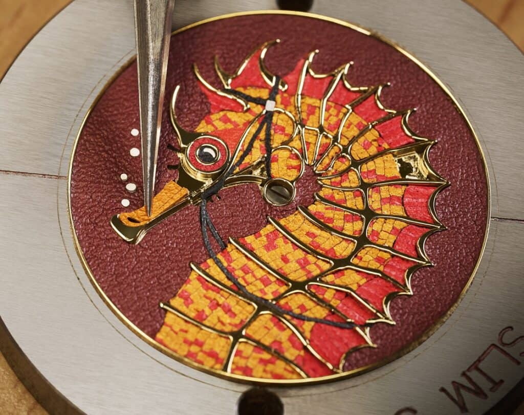 At the heart of the composition is a seahorse illustrated by London-based artist Stuart Patience—its whimsical silhouette transformed into a dial rich with texture and nuance. The process begins with the engraver’s steady hand, tracing the creature’s delicate curves and chiselling depth into the gold with a succession of traditional tools. Once the sculptural relief is complete, the dial passes to the leather marquetry specialist, who trims vibrant Swift calfskin in contrasting hues down to an extraordinary 0.5 mm thickness.