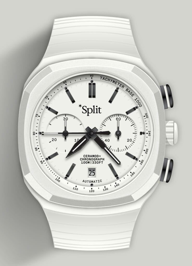 Powering the watch is a bi-compax automatic chronograph movement from the Seiko family, chosen for its proven reliability and mechanical credibility. The case is crafted from Split’s proprietary Ceramod+ material and paired with a durable FKM rubber strap, ensuring both robustness and all-day wearability.