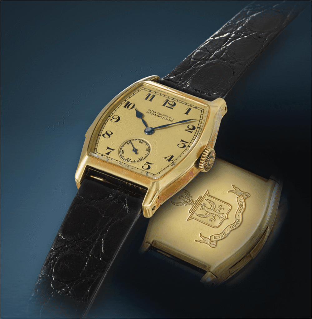 One of Graves’ earliest commissions for Patek Philippe was a highly personalised yellow-gold tonneau-shaped minute-repeating wristwatch (above), which records show that was acquired on the 16th of June 1928. Not only was this Graves’ first Patek Philippe wristwatch, but it’s also thought to have been the first minute-repeating wristwatch made by Patek Philippe. At around 40mm long, the gold watch was large, even by today’s standards, while the sound of the minute-repeating mechanism was enhanced by the relative softness and malleability of the gold. It was engraved with the Graves family coat-of-arms on the reverse.