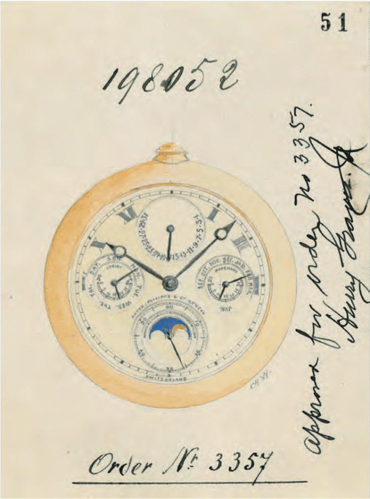 Preliminary drawing of the watch, signed and approved by Henry Graves. Image courtesy of Patek Philippe Museum