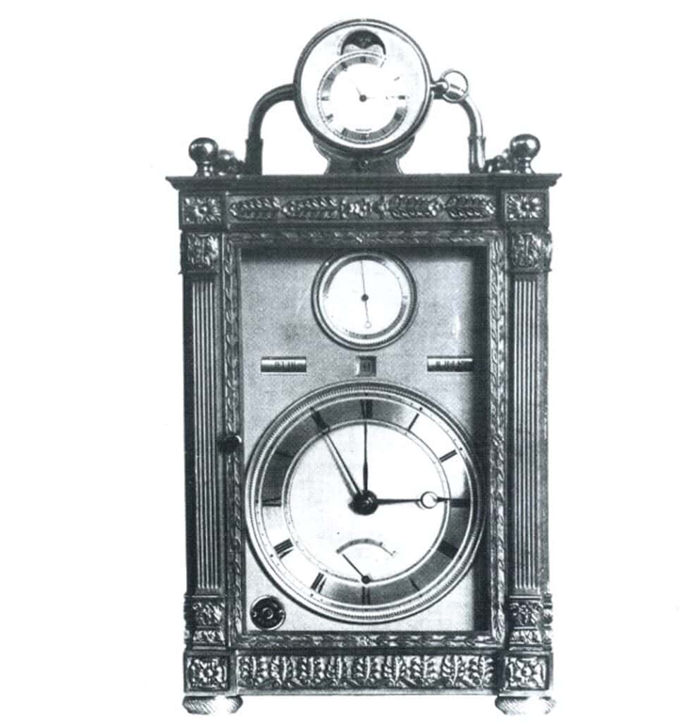 Conceived by Breguet in 1795 and presented to the public for the first time at the national exhibition of 1798, the sympathique clock was a system comprising a clock and watch. The clock was designed to hold the watch which, when placed in a recess, was automatically adjusted and reset. The term ‘sympathique’ was chosen by Breguet to express the notion of harmony and concord, ‘sympathy’ being used in its mystical sense to signify the universal principle that unites in harmonious accord the organs of the human body. Abraham-Louis sold only five examples, all different, before his death in 1823, and Antoine-Louis only one, in 1830. All were bought by kings or princes. Salomons’ Pendule Sympathique Clock made by Rabi with watch no. 722 made by Breguet was originally sold to a ‘person unknown’ in about 1812 for 25,000 francs.