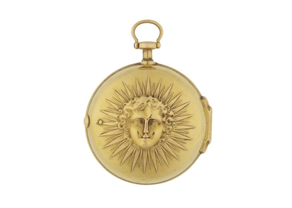 This is a remarkable gold pair-cased repeating watch by Benjamin Gray, London, circa 1730 (above). The sumptuous gold outer case is adorned with a finely executed repoussé head of Apollo (below), the god of light and the passage of time and fitted with a watch glass. Within, the inner plain gold case has had its bezel and glass removed so that it fits, rather tightly, inside the outer shell. Both cases carry London hallmarks for 1730, firmly anchoring the piece in the golden age of English watchmaking.