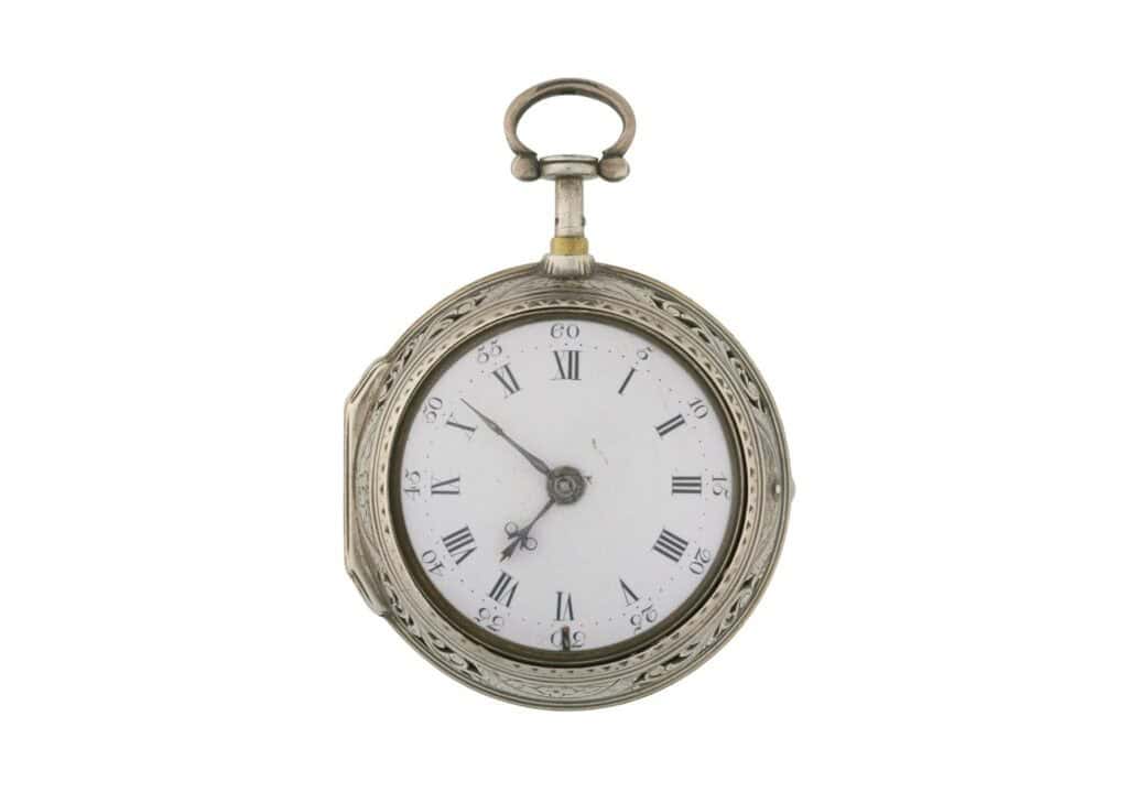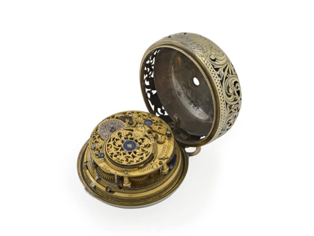The pair cased repeating watch (above) by Daniel Quare, was made in England c.1710. Both silver cases are pierced and engraved. White enamel dial with steel beetle hands. Movement with verge escapement, diamond endstone, and repeating work. Signed on the backplate ‘Daniel Quare London 722’.