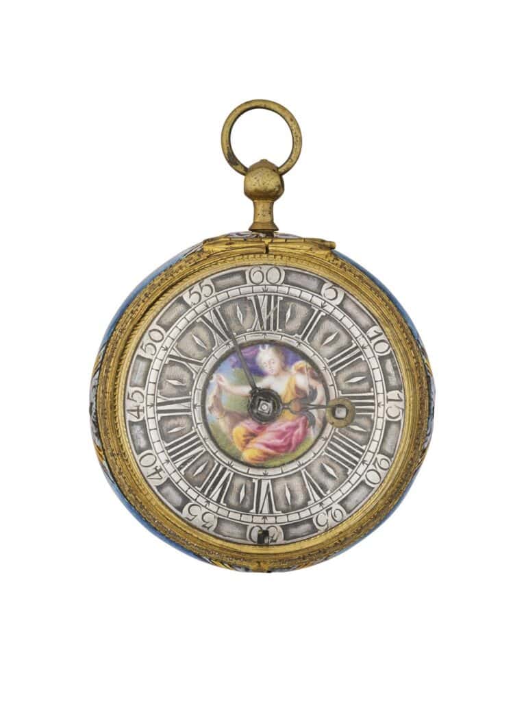This exquisite verge watch by Daniel Quare c.1712, is contained in a painted polychrome enamel case signed ‘Les Frères Huaud’ with a yellow enamel painted interior. Silver repoussé dial with a Huaud enamel plaque in centre. Dial winding at 3 o’clock. Steel hands. Verge escapement with broad-foot winged balance cock. Movement signed ‘Quare, London’.