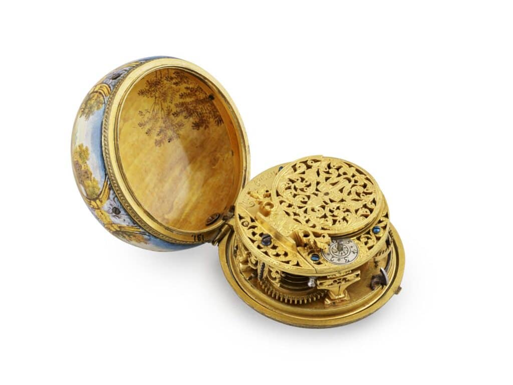 This red turtleshell and ormolu hour-striking horizontal table clock (above) has an alarm and quarter repeater. The clock’s case is a work of decorative art in of itself, brimming with high-specification details. These include the exotic and costly use of red turtleshell for the veneer that covers each side of the unusual octagonal shaped case. The clock also boasts numerous custom gilt mounts and decorations. Added extras also ensure that it functioned perfectly as a portable boudoir alarm clock. All this suggests that it was a special commission for a well-to-do traveller.