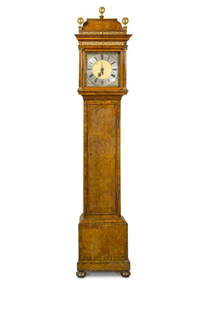 The oak case in the style of Daniel Marot, is veneered in walnut. The brass dial has date aperture, silver spandrels and applied chapter-ring signed: ‘Dan Quare London’. An additional signature ‘Daniel Quare, London’ is found underneath the chapter-ring. The movement, of year duration, has a going train of six wheels, anchor escapement and seconds pendulum. It was commissioned by Thomas, 1st Earl Coningsby (1656 – 1729) for a visit from King William III to his home. Later owned by Sir Richard Arkwright (1732 – 92).