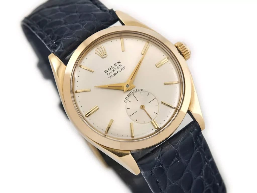 At just 3.45mm thick, the movement allowed the case to sit flat and refined on the wrist. It also included a subsidiary seconds dial at six o’clock, a detail rarely seen on time-only Rolex watches. Production ceased by 1962, making the Veriflat a rare and highly collectible piece today.