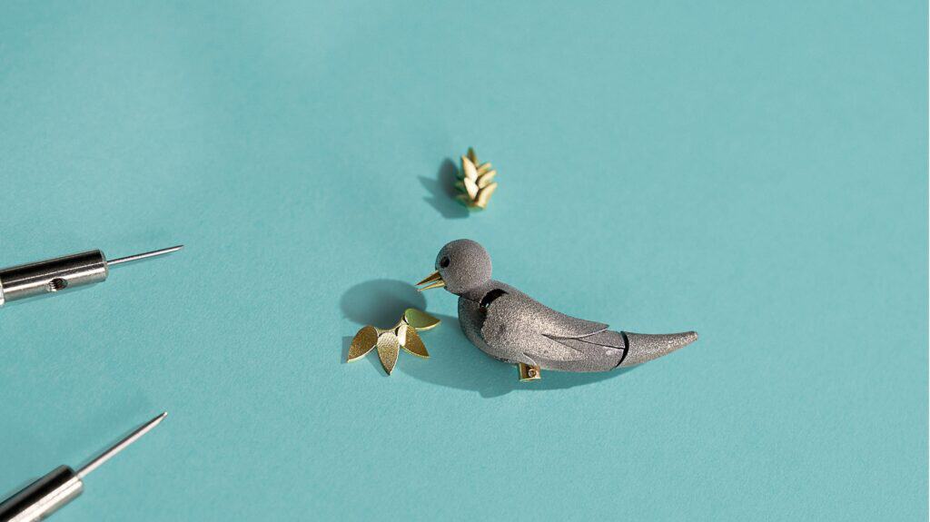 The structure itself is a feat of craftsmanship. Each corner is anchored by titanium pillars accented with gold and meticulously snow-set with brilliant-cut diamonds, producing an uninterrupted play of light. The bird, crafted from lightweight titanium, comprises 28 individual components, including articulated wings and beak, a polished gold neck ruff, and diamond-set surfaces punctuated by vivid ruby eyes. In total, the piece represents some 130 hours of gem-setting alone.