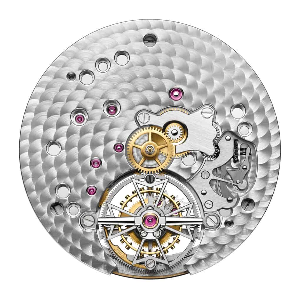 The tourbillon itself is engineered with purpose. Its openworked cage uses a peripheral drive, eliminating the need for a central pinion and ensuring more efficient energy transmission from barrel to balance. Every one of the movement’s 188 components is finished to the highest standard: circular-grained mainplate, Côtes de Genève bridges with hand-beveled edges, polished and chamfered screws, grained wheels, and a delicately cradled tourbillon shank.