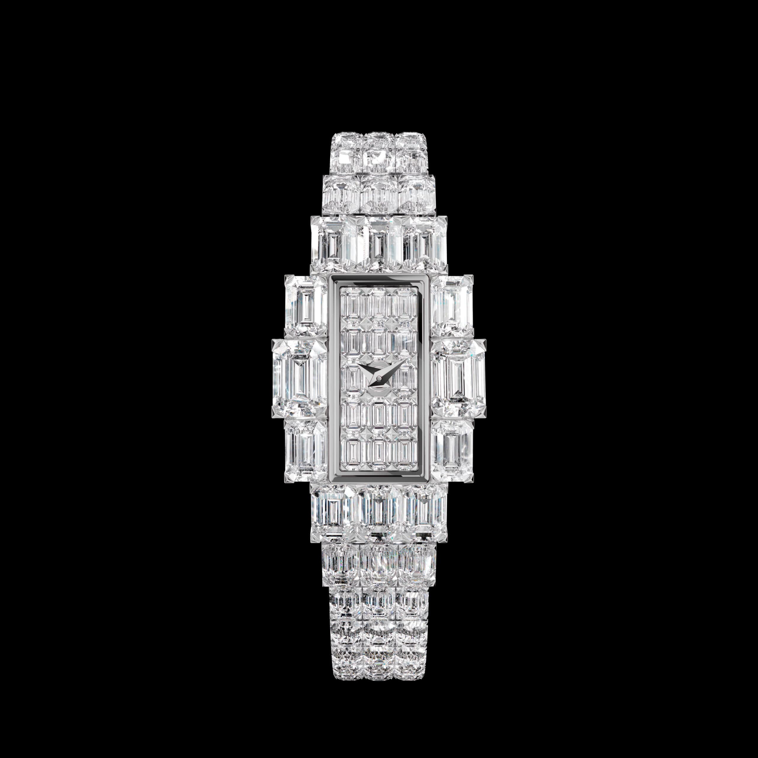 Fully paved with 105 emerald-cut diamonds, claw-set