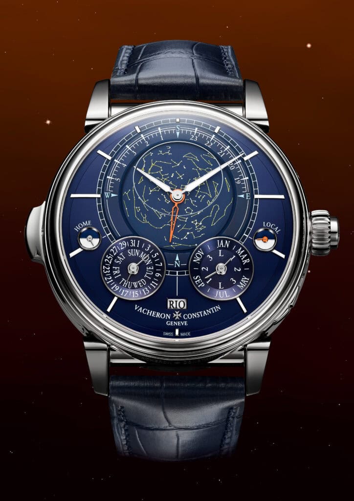 - On one side, a celestial dial evokes the night sky with a rotating Northern Hemisphere star chart, perpetual calendar, and dual time zone display.