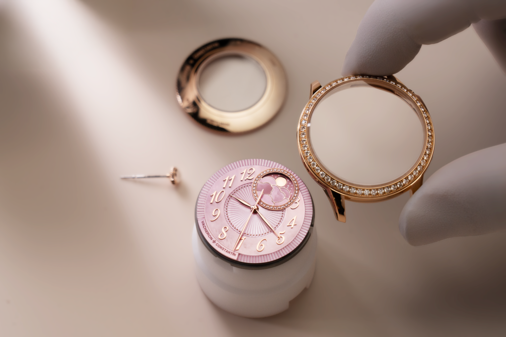 At first glance, the dial enchants. Crafted from pink mother of pearl, it shimmers with soft, cloud like iridescence, echoing the first light of a spring dawn. Subtle variations in tone ensure that no two dials are ever identical, giving each watch its own personality. Between one and three o’clock, the moon phase complication emerges, framed by diamonds and set against a dusky pink sky. A golden moon drifts through delicate mother of pearl clouds, waxing and waning with quiet elegance.